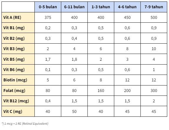 Agar kebutuhan vitamin terpenuhi dengan baik, Anda dapat mengikuti pedoman AKG dari Peraturan Menteri Kesehatan RI no. 28 tahun 2019. Dilansir dari Hello Sehat, berikut rangkuman AKG harian yang bisa dijadikan acuan konsumsi vitamin khusus untuk bayi dan anak, laki-laki dan perempuan.