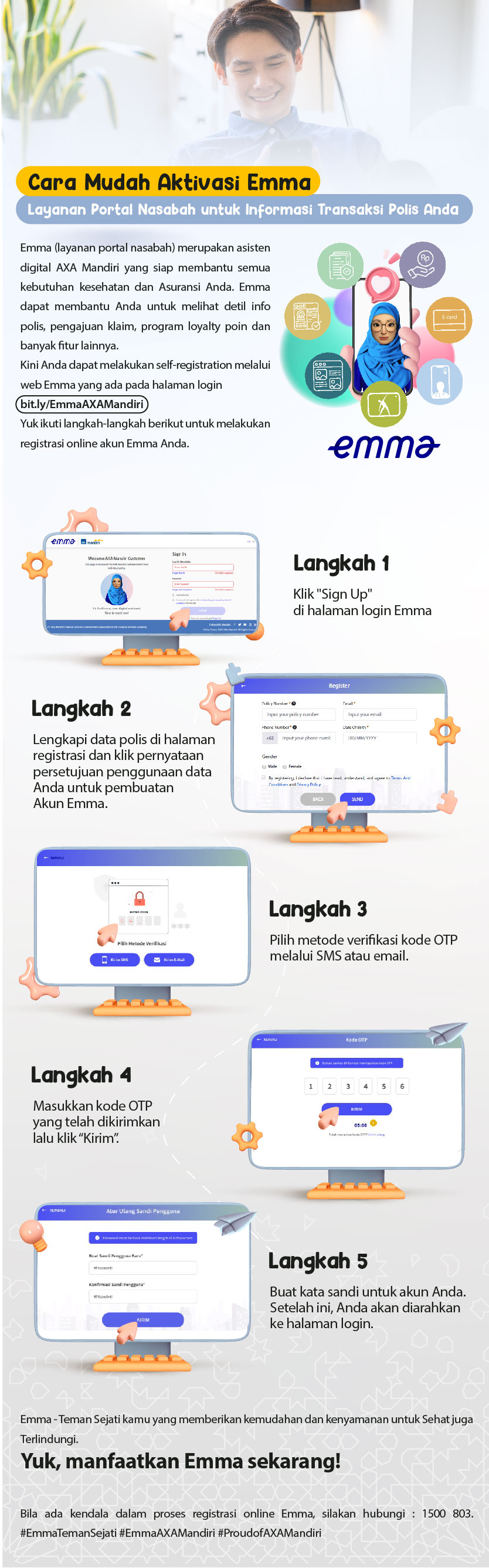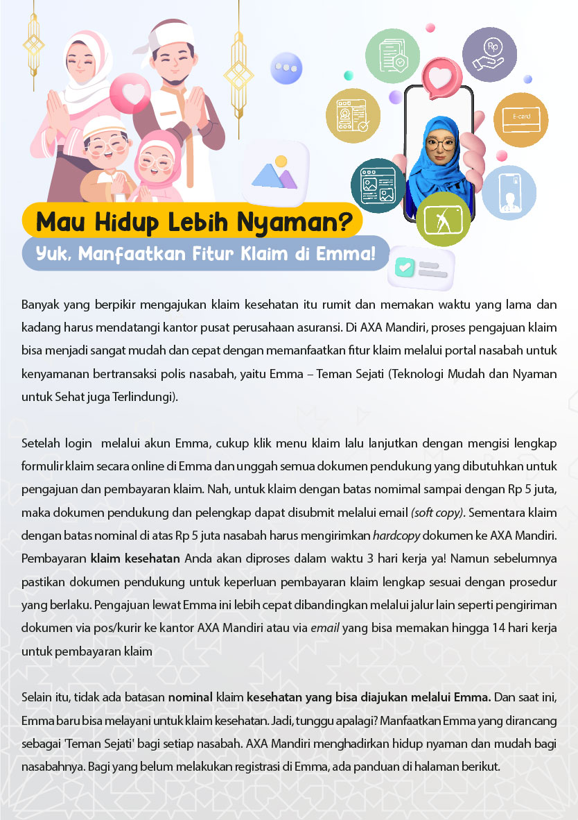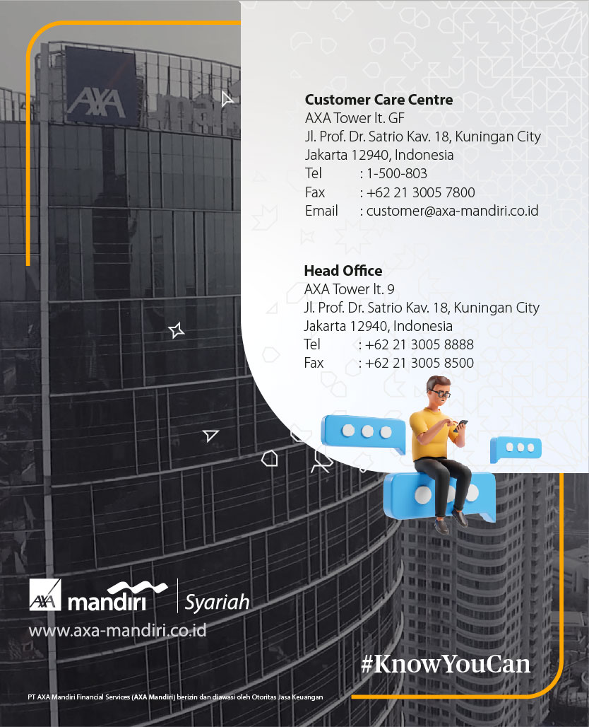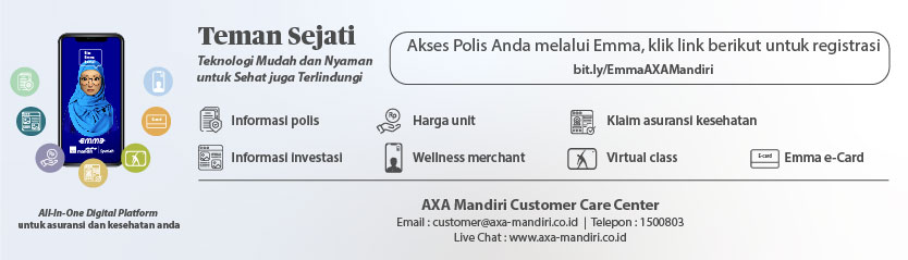 Selamat datang di Customer Care Corner AXA Mandiri. Kami siap membantu memberikan pelayanan menyeluruh bagi Anda dengan memberikan penjelasan komprehensif mengenai produk dan manfaatnya, juga mengenai polis, pembayaran premi, klaim, perubahan polis, dan lain-lain.