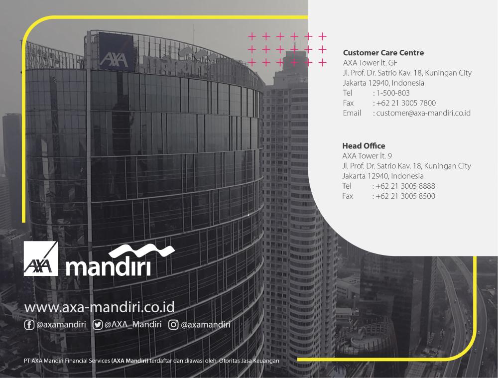 Selamat datang di Customer Care Corner AXA Mandiri. Kami siap membantu memberikan pelayanan menyeluruh bagi Anda dengan memberikan penjelasan komprehensif mengenai produk dan manfaatnya, juga mengenai polis, pembayaran premi, klaim, perubahan polis, dan lain-lain.